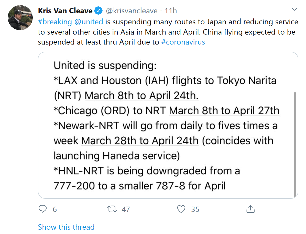 该航空公司表示,从3月3日到4月24日,东京到美国洛杉矶和休斯顿的航班将暂时被取消;从3月28日到4月24日,每天一次的纽瓦克至东京航线将减少到每周5次;从4月开始,檀香山飞往东京的航班将从一架波音777-200降级至一架较小的787-8。
