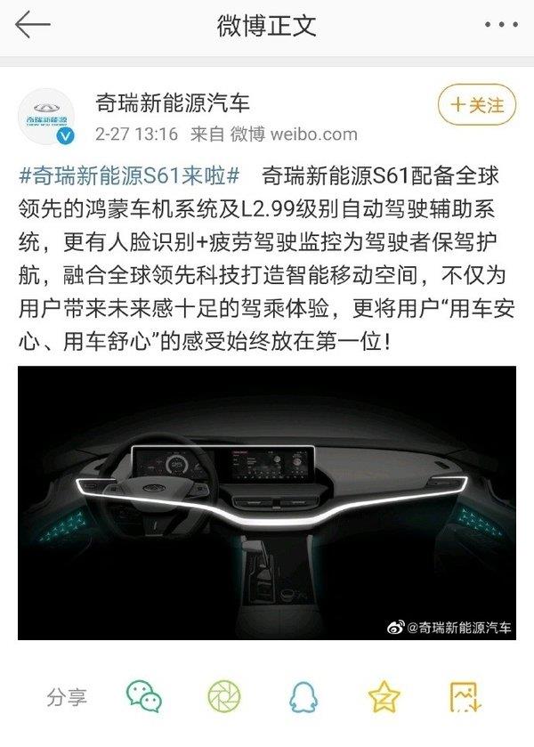 据微博截图消息,奇瑞新能源汽车在宣传奇瑞新能源 S61汽车时,表示,奇瑞新能源 S61配备了全球领先的鸿蒙车机系统及L2.99级别自动驾驶辅助系统,还有人脸识别+疲劳驾驶监控等为驾驶者保驾护航。