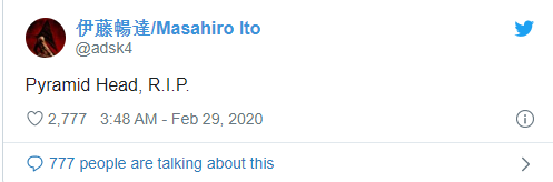 值得一提的是,前《寂静岭》美术总监伊藤畅达似乎也在有意无意地进行互动,发布了一个推文:“三角头,安息(Pyramid Head, R.I.P.)”。此前他曾在采访中表示他回归《寂静岭》系列的唯一条件是他能杀死三角头。