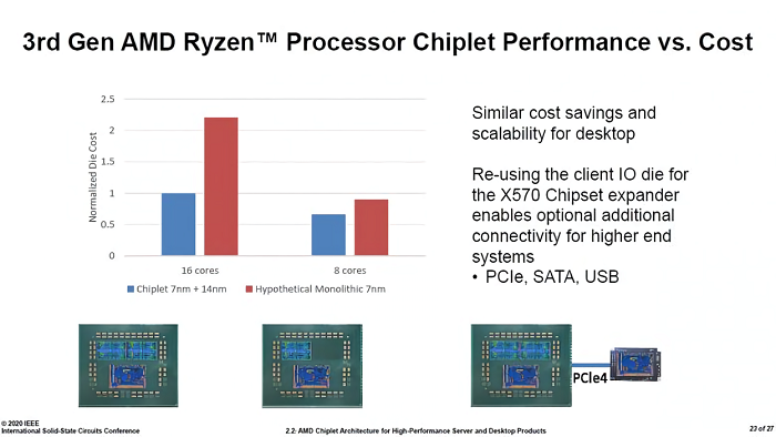 在本月早些时候举办的 2020 国际固态电路会议(ISSCC)主题演讲期间,AMD 讲述了其通过多芯片模块化(MCM)方案所取得的财务上的巨大优势。正如 TechPowerUp 强调的那样,通过将尖端的 7nm 工艺用于 CPU 内核的制造、同时将普惠型的工艺应用于 I/O 控制芯片等其它模块,该公司得以在成本节约上取得重大的成就。