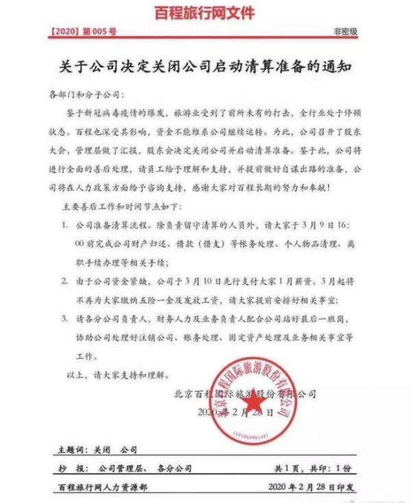 2月29日,一份名为《关于公司决定关闭公司启动清算准备的通知》的百程旅行网内部文件在各社交网络平台流传。文件显示,受新冠疫情影响,百程资金不能维持公司继续运转,为此,公司将进行全面善后处理,请员工给予理解和支持,并提前做好自谋出路的准备。