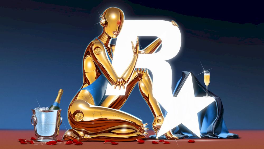 其中一个LOGO作为侧边栏的背景出现在Rockstar的网站上。背景中展现了一位女性机器人以半跪姿势抱着Rockstar的发光LOGO,在该LOGO的星型上还放置着一杯香槟。该图的配色和美术风格与R星已有的游戏并不相符。