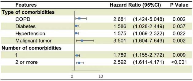 具体到基础疾病的种类上,癌症和慢性阻塞性肺疾病(COPD),是最可能增大患者不良预后的,但只要有一种基础疾病,就与患者的不良预后风险升高79%有关,同时有两种以上的话,风险更是会升高1.59倍(HR 2.59)!