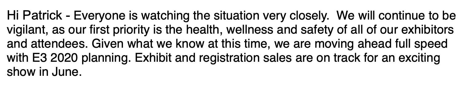 “所有人都在密切关注局势,我们会继续保持警惕,因为我们的首要任务是保证所有参展商和与会者的健康和安全。鉴于我们目前所知的情况,我们依旧在全速推进E3 2020的规划工作。”