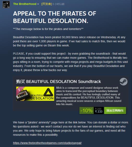 《BEAUTIFUL DESOLATION》是一款2月27日登陆Steam的2D冒险游戏。但发售还没到一周,游戏就陷入了严重的盗版问题中,以至于开发者不得不在Steam的社区中发布公告,希望那些下载了盗版的玩家给他们捐点钱,帮助工作室的维系。