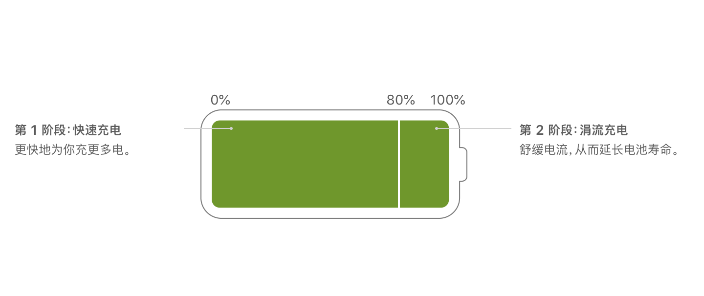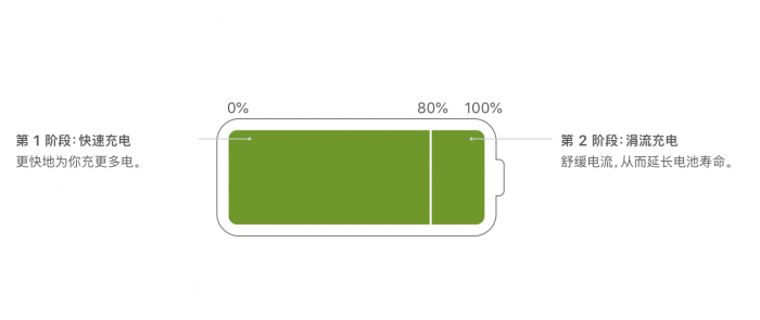 安卓厂商在快充技术上已经非常超前,这几年开始重视起了电池寿命。苹果也在 iOS 13 中增加了“优化电池充电”的选项,前 80% 快速充电,后 20% 会根据用户习惯,快起床前再进行涓流充电,从而延长电池寿命。