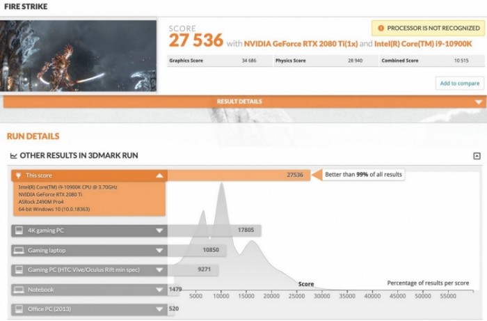 此次曝光的3DMark跑分在华擎Z490M Pro4主板上测试,配套硬件为8GB DDR4 3200MHz内存,显卡为RTX 2080Ti。