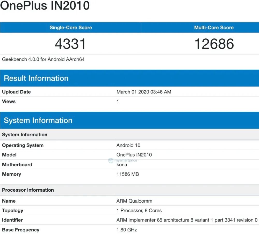 在GeekBench 4.0.0跑分库中,主板名称为“Kona”,装备了时钟频率1.80GHz的八核高通骁龙865处理器,搭配12GB的内存。一加8处理器采用高通骁龙865,内存采用LPDDR5+UFS3.0规格组合。