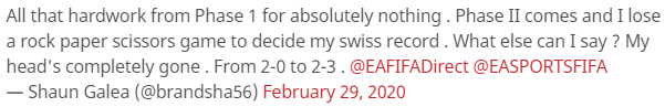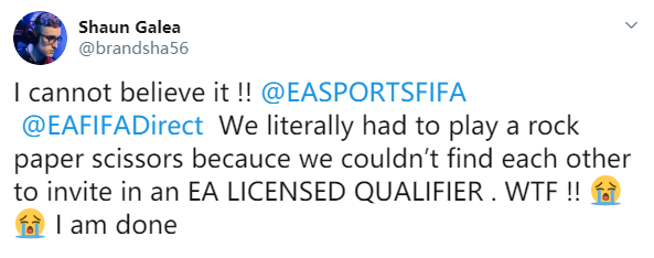 “我简直不敢相信!我和对手被要求通过石头剪刀布来决胜负,因为我们无法在EA官方组织的预选赛中搜索到对方。WTF!!”