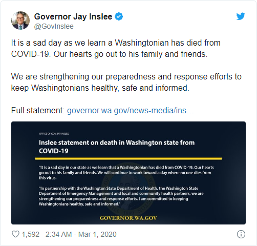 华盛顿州卫生部门报道称,King County 已确认美国第二起由新型冠状病毒感染导致的死亡病例。继前一日宣布一名 50 岁男子感染死亡之后,位于 Kirkland 的 EvergreenHealth 医疗中心又于次日宣布了一名 70 岁的男子死亡。同时该病导致当地另外三人住院,目前全州已有 10 例确诊。