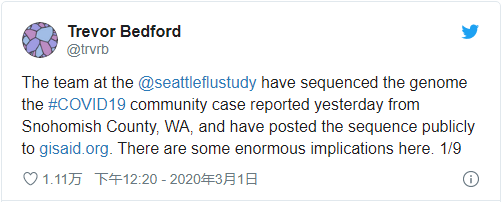 Bedford 在 Twitter 上发出警示:“华盛顿州或正处于一次大规模疫情爆发前的平静,但当前的确诊标准太过苛刻,比如必须要有直接前往中国的历史,才导致此前一直未被发现”。
