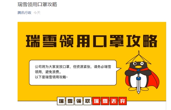 近日,腾讯公司正式复工。今日,腾讯行政发布领用口罩攻略。官方表示,公司将为大家发放口罩,但资源紧张,请务必“瑞雪”领用,避免浪费。据悉,腾讯将为正式员工(包括实习生、毕业生、发薪顾问)、人力和项目外包、短期劳务发放口罩。发放数量每周每人10个。
