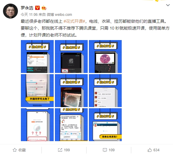 第一条微博,老罗称:“最近很多老师都在线上 #花式开课#,电线、衣架、挂历都能做他们的直播工具。要聊这个,那我就不得不推荐下腾讯课堂,只需 10 秒就能极速开课,使用简单方便,计划开课的老师不妨试试。 ”