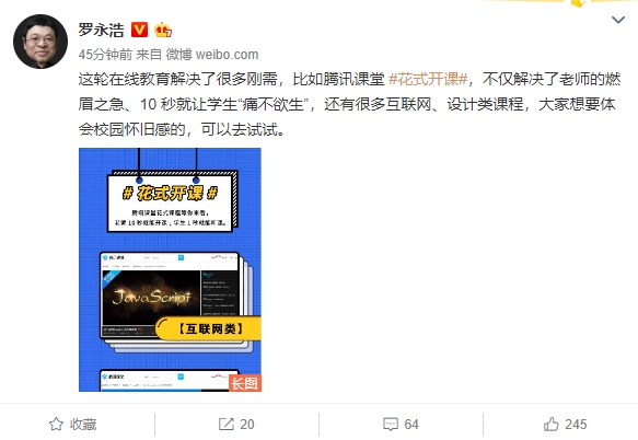 第二条微博中,他表示:“这轮在线教育解决了很多刚需,比如腾讯课堂 #花式开课#,不仅解决了老师的燃眉之急、10 秒就让学生‘不欲生’,还有很多互联网、设计类课程,大家想要体会校园怀旧感的,可以去试试。 ”