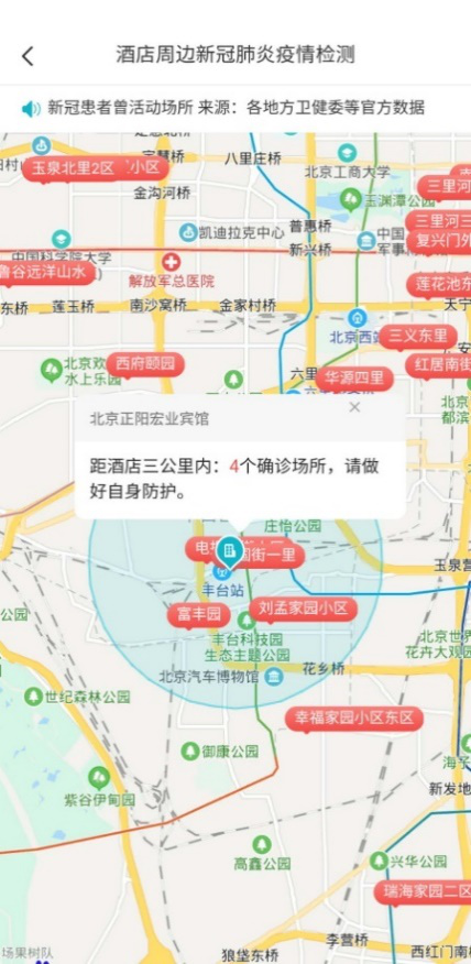 用户点进酒店详情页,位于页面的“疫情雷达”橙色图标就会自动显示酒店所在城市新增病例、现有确诊病例,以及酒店所在地周边3公里内是否有确诊病例等疫情,还能点进详情页,通过地图形式查看详细确诊病例位置。