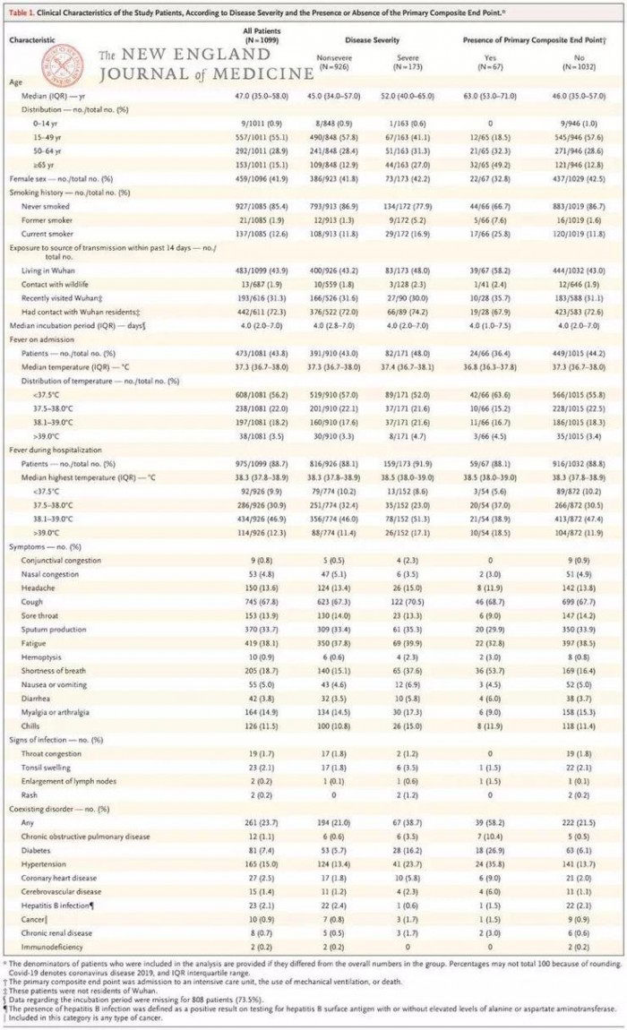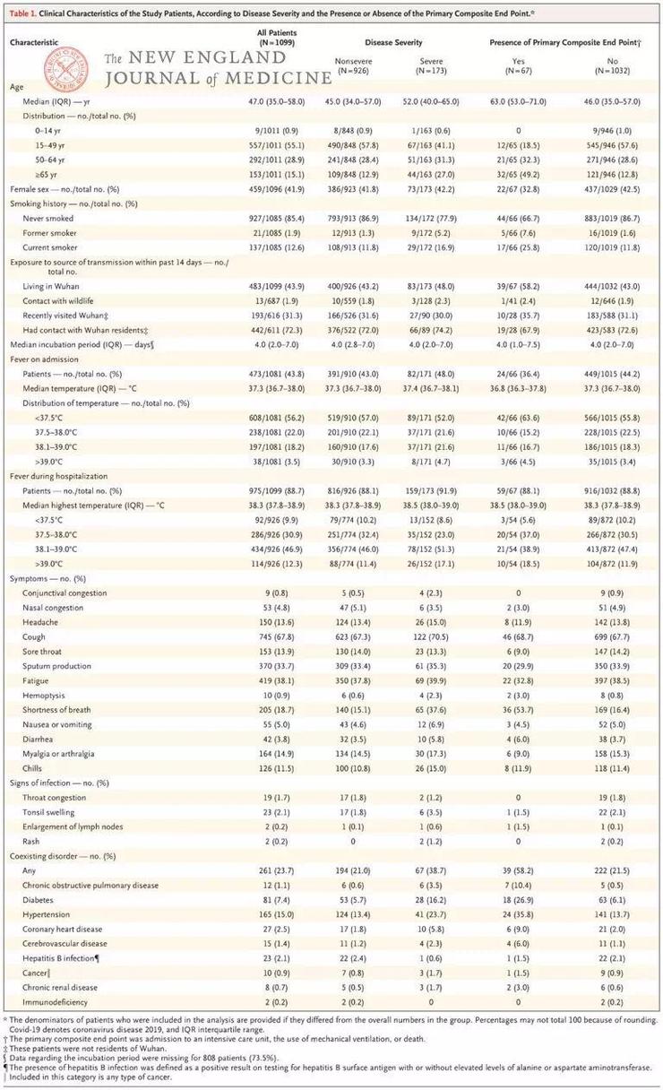 在国家卫健委的支持协调下,研究团队由钟南山院士牵头收集了自 2019 年 12 月 11 日-2020 年 1 月 29 日全国 30 个省、自治区、直辖市共 552 家医院的 1099 例经实验室确诊的新冠病毒感染患者的临床信息。