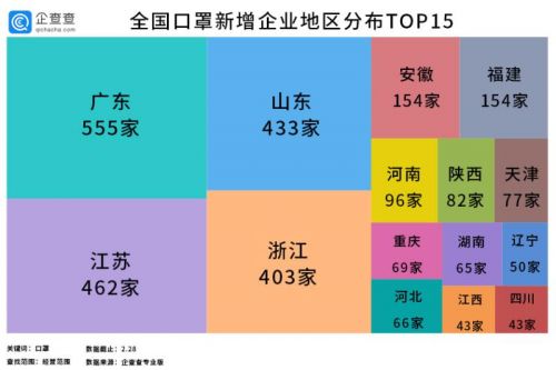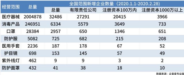 据企查查专业版数据显示,自2020年1月1日至2月28日,经营范围涉及医疗器械、口罩等防护用品企业增速可观,全国范围内医疗器械企业新增量超3万家,消毒产品次之。其中,有2957家新增企业经营范围涉及口罩生产业务。