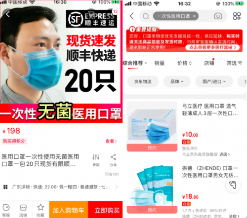 目前,在天猫平台,20只医用一次性口罩的价格高达198元,比疫情发生前价格增长超过5倍。在京东平台,京东自营的口罩价格相对合适,但大都处于需要预约、且限制数量购买的状态。
