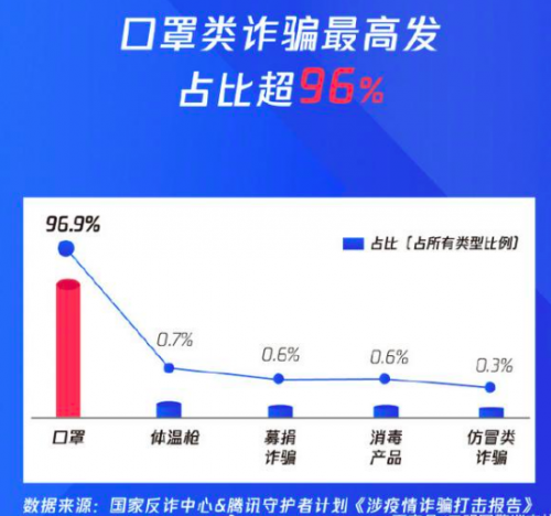 另据公安部刑侦局通报,截至2月27日20时,全国公安机关共侦破利用疫情实施电信网络诈骗的案件8926件,抓获嫌疑人3799人,涉案金额超过2.56亿。从国家反诈中心&腾讯守护者计划《涉疫情诈骗打击报告》数据来看,在所涉案件中,口罩类诈骗最高发,占比超过96.9%。