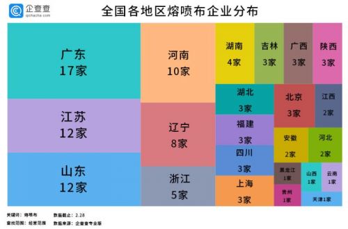 同时,制约医用口罩产能的瓶颈之一,便是口罩核心材料熔喷无纺布产量极低,据企查查专业版数据显示,截至2月28日,国内经营范围涉及熔喷布的企业共100余家,主要集中在广东、江苏、山东、河南四省,占全国的49.51%。