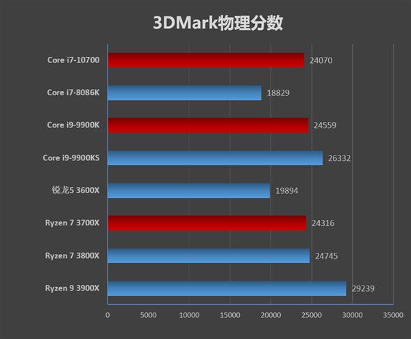 一般来说,3DMark每次跑出来的成绩可能会有1%左右的误差,不过i7-10700的24070与锐龙7 3800X的24745之间差了将近700分,差距为3%,不应该算作误差。而锐龙7 3700X的24316比i7-10700高了246分,可以算作是测试误差,二者是同一级别。