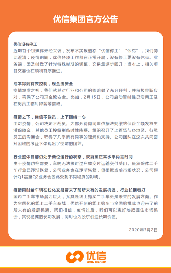 近期有个别媒体未经采访,发布不实报道称“优信停工”“休克”,我们特此澄清:疫情期间,优信各项工作都在正常开展,没有停工更没有休克。业务端,因及时做了针对特殊时期的调整,交易量逐步回升;资本上,相关项目交易也在顺利有序推进。