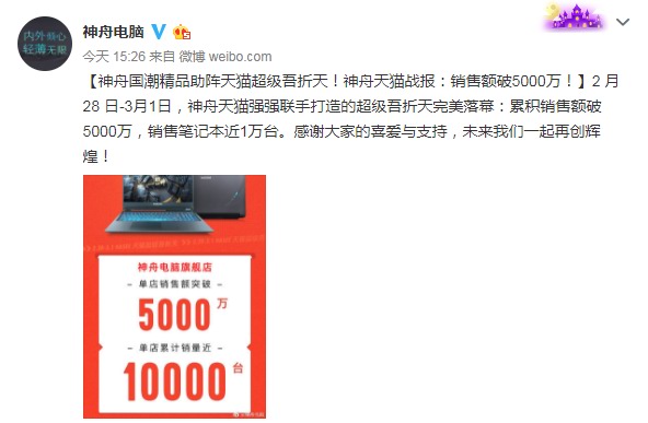 今日(3月2日)神舟电脑官方微博发布天猫战报,2月28日-3月1日,在神舟和天猫超级吾折天活动中,神舟电脑累积销售额破5000万,销售笔记本近1万台。