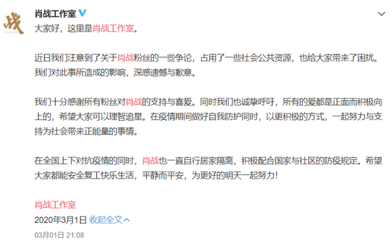 意识到事情的严重性,肖战工作室及肖战全球后援会才相继发布道歉声明,#肖战工作室道歉#也很快冲上热搜第一。
