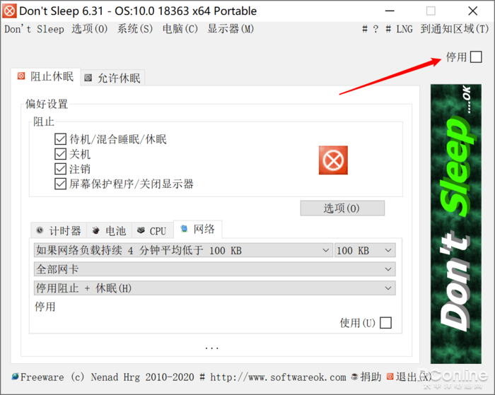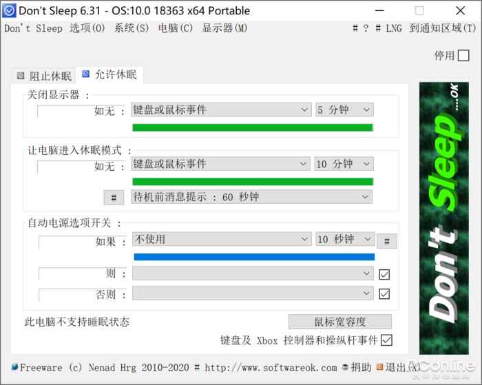 Don't Sleep有安装版和绿色版,这里以绿色版为例。开启后,就可以看到界面中的各类功能选项了,软件也会自动起效。为什么说这个工具非常实用、堪称神物?这就来细说。