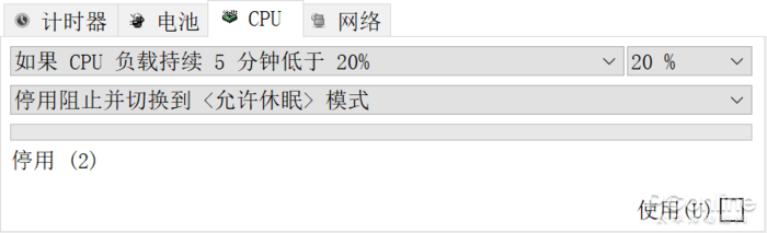 又例如,你是挂机编译程序,想要电脑编译完了就自动休眠,就可以在“CPU”一栏中设置,当CPU负载持续低于某个状态时,退出挂机状态;