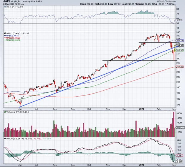 星期一苹果高开3%,给了投资者信心。在随后的交易中,苹果股价没有随标普500指数下跌。投资公司Oppenheimer发表投资报告称投资者应当逢低吸入,把苹果股票评级上调为“跑赢大盘”,把目标股价上调至320美元后,苹果股价涨幅一度达到7%。与上周五的低点相比,苹果股价上涨幅度达到14.5%。一方面,苹果股价仍然远低于最近的高点和300美元;另一方面,星期五的收盘价比低点高出逾6个百分点,星期一股价继续上涨。在突破100天均线和上升支撑价位后,目前苹果股价上涨至290美元以上,投资者现在关心的是它能否重回300美元价位和50日均线上方。如果苹果股价能重回300美元价位,这会不会成为阻力价位或苹果能否突破这一价位将很关键。如果苹果能突破这一价位,就可能上涨至315美元。另外,投资者需要关注100天均线。股价跌至100天均线下方,意味着苹果失守上升支撑价位,可能继续下跌,甚至跌至200天均线。今天常规交易中苹果股价涨幅达到9.31%,成涨幅最高的道指成分股。