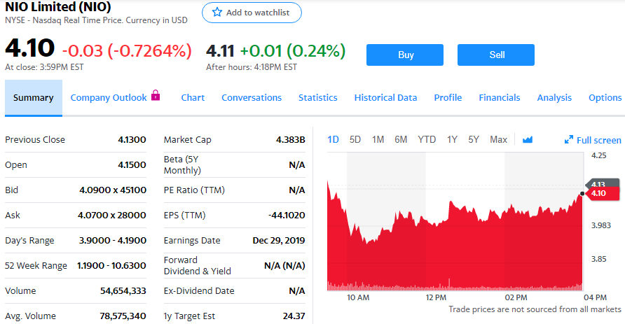 蔚来股价一度探底3.9美元,跌幅接近6%