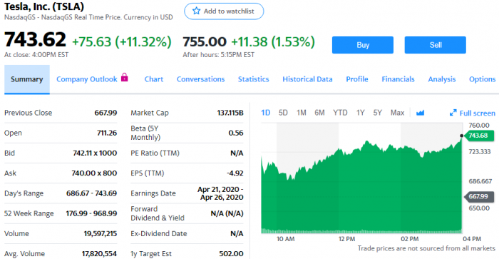 星期一早盘,特斯拉股价涨幅一度达到5.3%,扭转了此前5连跌的颓势。过去5天,由于市场担忧新冠肺炎疫情的影响,特斯拉股价累计下跌25.9%。与2月19日917.42美元的高点相比,特斯拉股价更是下跌27.2%。尽管股价大跌,摩根士丹利分析师亚当·乔纳斯(Adam Jonas)仍然维持对特斯拉股票的“减持”评级,以及500美元的目标股价——比当前股价低29%,在投资报告中称投资者应当对“具有挑战性的”第一季度做好准备,因为他认为华尔街对特斯拉营收和自由现金流的预期会略有下降,“即使不考虑疫情的影响,我们仍然预计第一季度特斯拉业绩会相当疲软,因为它经历了中国工厂投产和Model Y量产,部分欧洲市场(例如荷兰)需求会更为疲软。另外,政府津贴也在退坡”。过去3个月,特斯拉股价翻了逾一番(上涨110%),而标普500指数下跌了4.9%。常规交易中,特斯拉股价上涨75.63美元,涨幅为11.32%,报收于743.62美元。盘后,特斯拉股价一度上涨18.33美元。