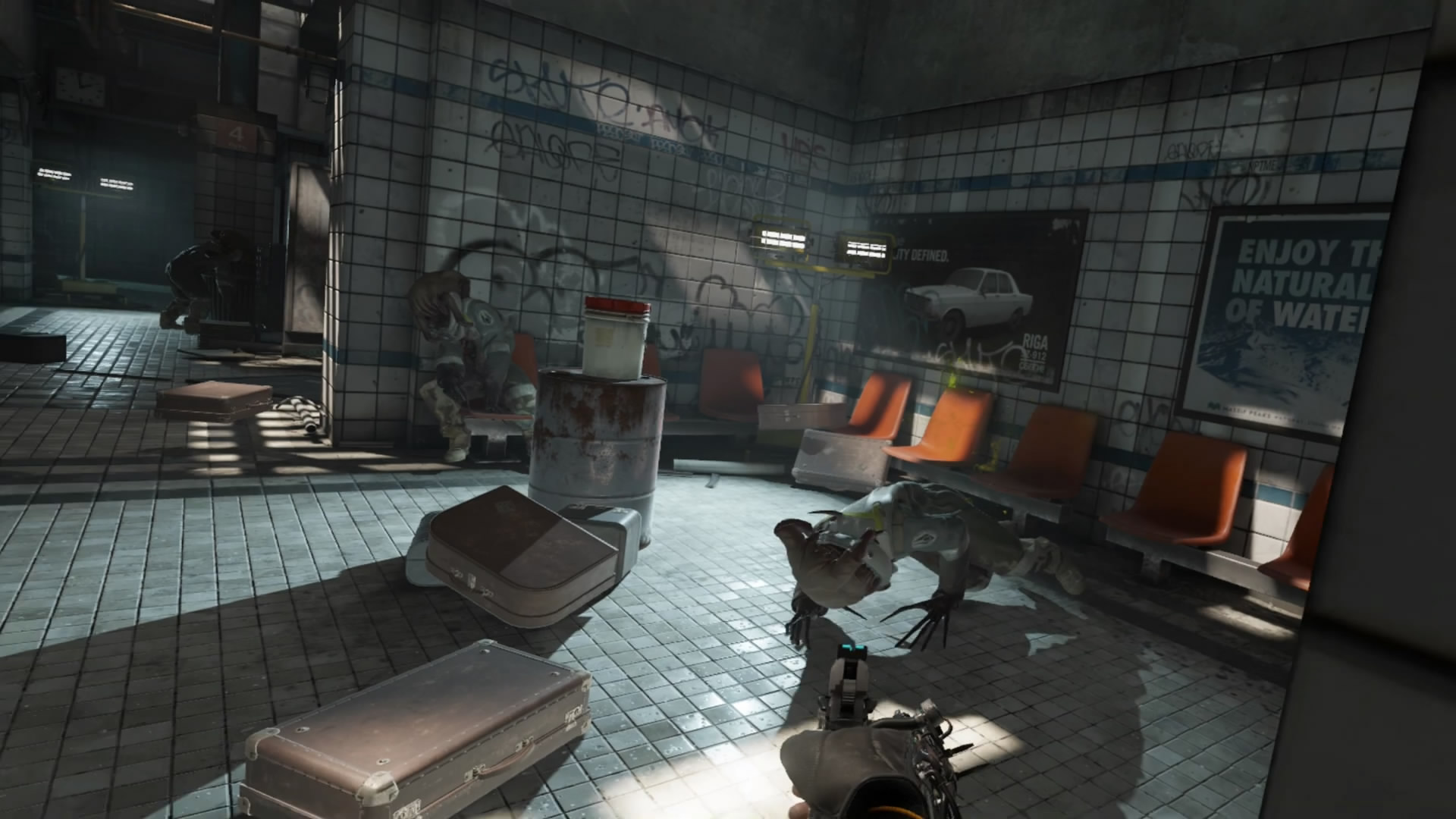 玩家能全身心沉浸在极具深度的环境交互、解决谜题、探索世界和几可乱真的战斗之中。侧身绕过断壁残垣、猫腰避开藤壶怪,开出原本不可能成功的一枪。 在架子上四处翻找治疗用注射器以及霰弹枪子弹。 操控工具黑入外星人接口。 朝窗外扔出一个瓶子来引开敌人注意。 把脸上的猎头蟹扯下来扔出窗外。