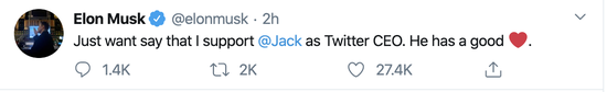 “我只想说我支持Jack(杰克·多西)担任Twitter的CEO,因为他有一颗善良的心。”在马斯克发布的一条推特中,他如是写道,其中用emoji爱心的符号代替了“心”这个字眼。