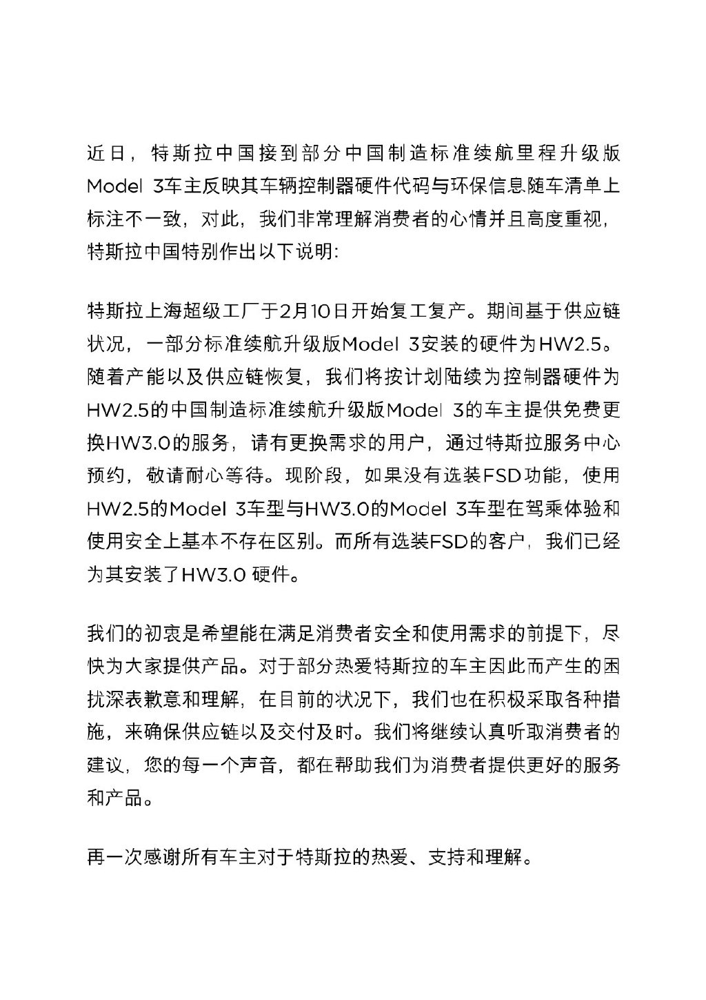 特斯拉上海超级工厂于2月10日开始复工复产。期间基于供应链状况,一部分标准续航升级版Model 3安装的硬件为HW2.5。随着产能以及供应链恢复,我们将按计划陆续为控制器硬件为HW2.5的中国制造标准续航升级版Model 3的车主提供免费更换HW3.0的服务,请有更换需求的用户,通过特斯拉服务中心预约,敬请耐心等待。