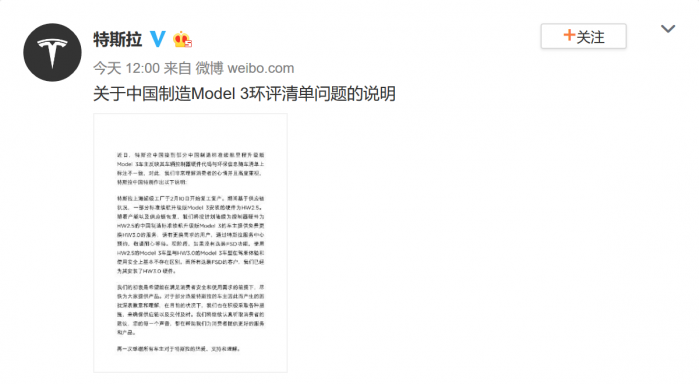 3月3日消息,近日,有车主曝出国内特斯拉使用老版本芯片的问题,特斯拉予以回应。特斯拉表示,特斯拉中国接到部分中国制造标准续航里程升级版Model 3车主反映其车辆控制器硬件代码与环保信息随车清单上标注不一致,对此,非常理解消费者的心情并且高度重视,特斯拉中国特别作出以下说明:
