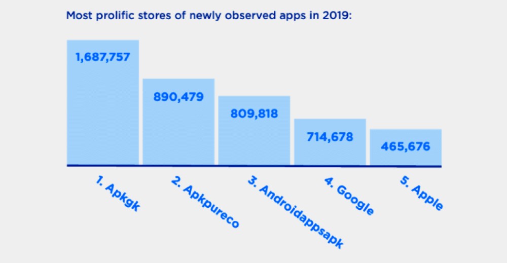 尽管App Store也并不完美,但苹果严苛的审查制度和掌控力使其很少有恶意程序和诈骗软件潜入。而根据RisKIQ公布的最新移动威胁报告,2019年就有超过25000个恶意程序上传到Google Play商城。而且去年几乎每个月都有关于Play商城恶意软件的报告。