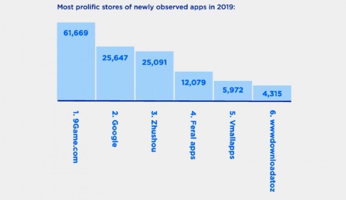 根据RiskIQ统计,2019年最危险的应用程序平台第一名是“ 9Game”,主要提供用户免费下载Android游戏,其中藏有大量的恶意软件,光是2019年就被查获有61,669款。另外Google也榜上 有名,由于App总数过于庞大,Play Store以25,467款名列榜单第二,3-5名分别为“ 360手机助手”,“ Feral app store”,“华为Vmall”。