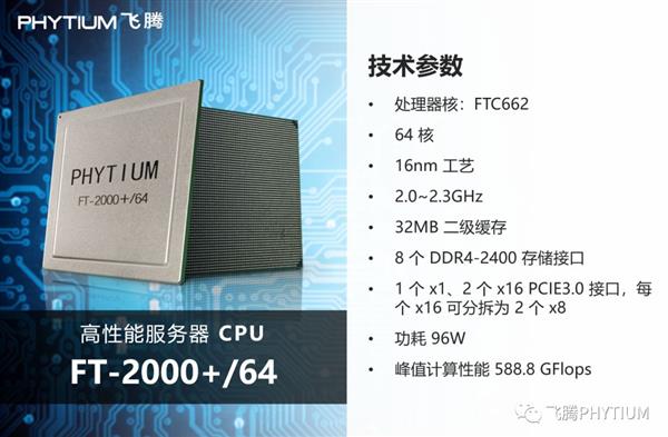 实测性能达到了国际主流服务器 CPU 同等水平,填补了国产高端通用 CPU 领域的空白,是中国首款自主设计的 64 核通用 CPU,也是国际上首款兼容 ARMv8 指令集的 64 核通用 CPU,能够胜任关键行业信息系统中对高端芯片的应用需求,有效护航信息安全。