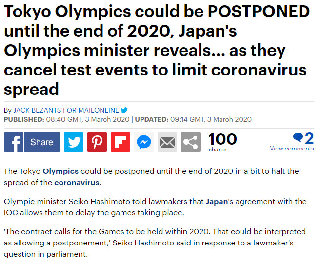 根据《每日邮报》消息,日本与国际奥委会达成协议,允许他们推迟东京奥运会的举行日期。日本奥运大臣桥本圣子在当地时间3日接受采访时表示:日本与国际奥委会达成协议,允许他们推迟奥运会的举行。“如果新冠病毒蔓延无法得到控制,原本在7月底开幕的东京奥运会可能会延迟今年年底才开始。”