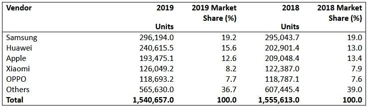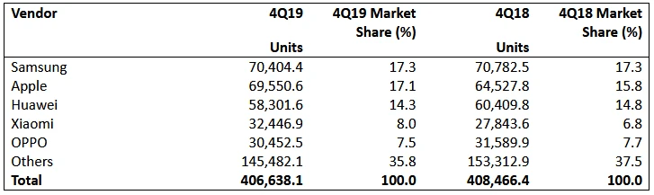 Gartner数据显示,总体而言,2019年第四季度全球智能手机销量同比下滑了0.4%,而全年销售额下滑了1%。