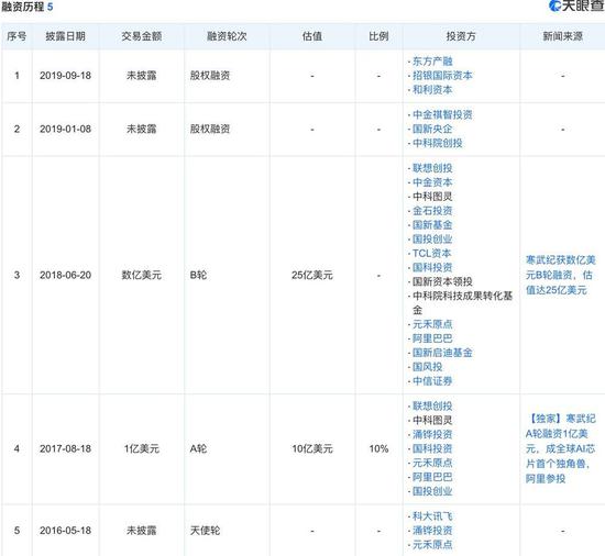 天眼查数据显示,寒武纪成立以来共进行过五轮融资,最近一次的是2019年9月,投资方为东方产融招银国际资本和利资本,融资金额暂未披露。