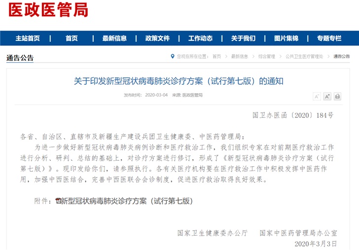 各省、自治区、直辖市及新疆生产建设兵团卫生健康委、中医药管理局:为进一步做好新型冠状病毒肺炎病例诊断和医疗救治工作,我们组织专家在对前期医疗救治工作进行分析、研判、总结的基础上,对诊疗方案进行修订,形成了《新型冠状病毒肺炎诊疗方案(试行第七版)》。现印发给你们,请参照执行。