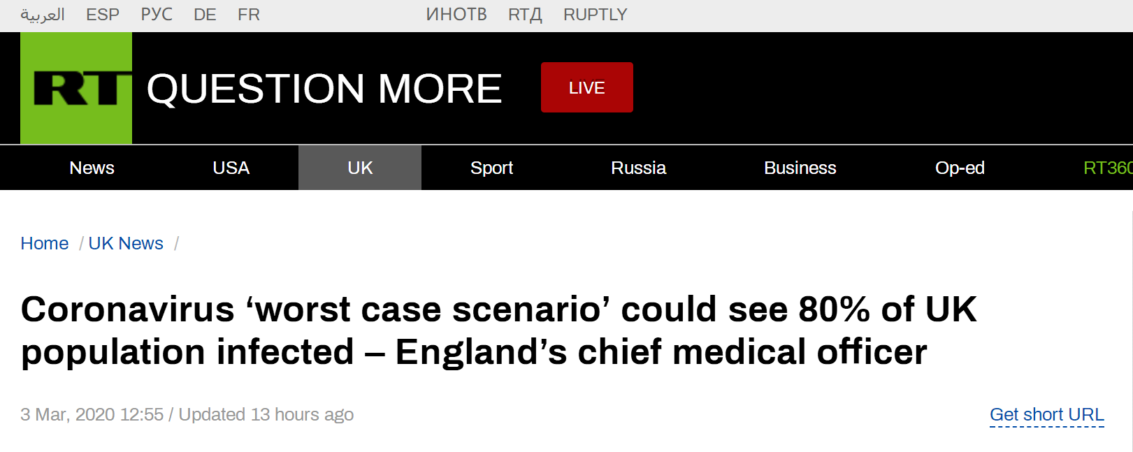 据“今日俄罗斯”(RT)3日报道,在当天的一场记者会上,英国首相鲍里斯公布了一份应对新型冠状病毒爆发的行动计划。英国英格兰首席医疗官克里斯·惠蒂则向媒体预测了最糟糕的状况:80%的英国人口可能会被感染,多达53万英国公民可能死于新冠肺炎。不过他同时强调实际感染情况很可能会远低于这个数字。
