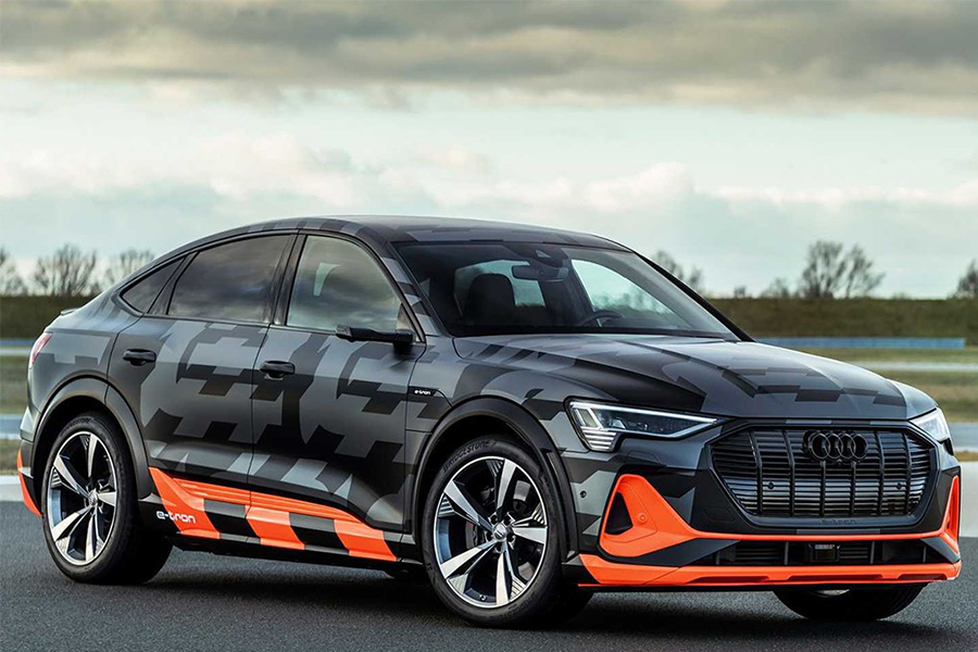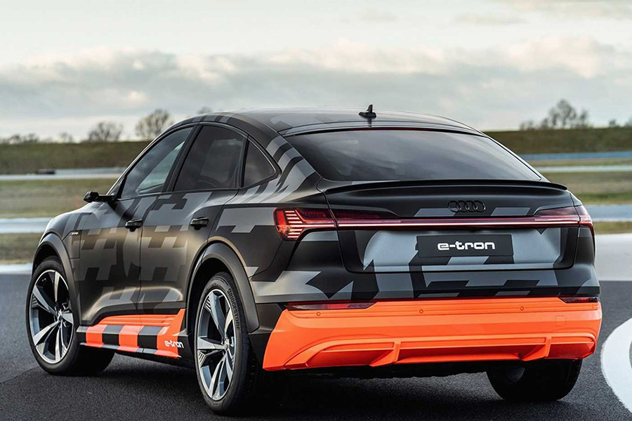 外观部分,奥迪e-tron S Sportback与普通版车型基本保持一致,采用了与奥迪e-tron相同的设计语言,大尺寸封闭式单幅格栅搭配浅铂金灰色的垂直竖条构成了e-tron车型独具一格的标志性特征。在矩阵式LED前大灯的下部,四条水平线条打造出e-tron车型专属的日间行车灯。为了突出其性能版车型的身份,奥迪e-tron S Sportback的车标及前中网进行了黑化处理,同时还配备了20英寸低风阻五辐轮圈、6活塞刹车卡钳、15.7英寸的刹车盘及宽度为23mm的轮拱,风阻系数为0.26Cd。