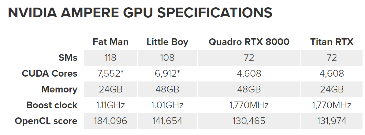 当然,结合曝光的NVIDIA Ampere核心“Fat Man”和“Little Boy”,18T也不算什么。分别7552和6912个CUDA的它们,FP32算力更是高达33.5T和27.9T。