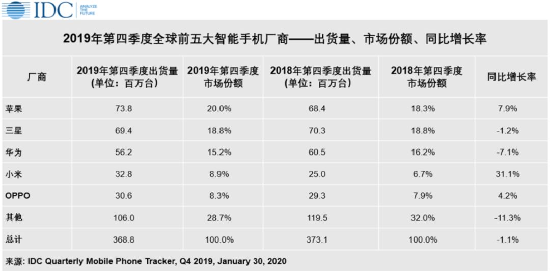 据IDC的跟踪数据显示,2019年第四季度,苹果累计出货量达7380万台,同比增长7.9%,取代三星成为了全球智能手机的销量冠军,市场份额升至20%,而三星的全球市场份额则下滑至18.8%。