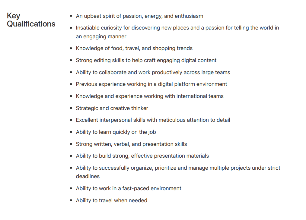 这项工作的资格包括:“对发现新地点的好奇心以及对以引人入胜的方式告诉世界的热情”,“对食物,旅行和购物趋势的了解”以及“强大的编辑技能,以帮助制作引人入胜的数字内容。 ”