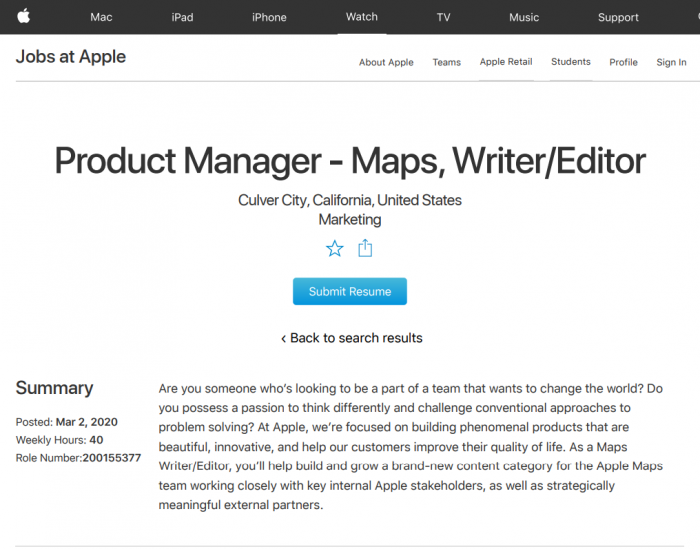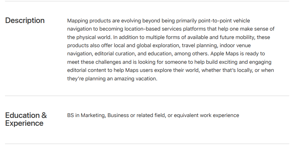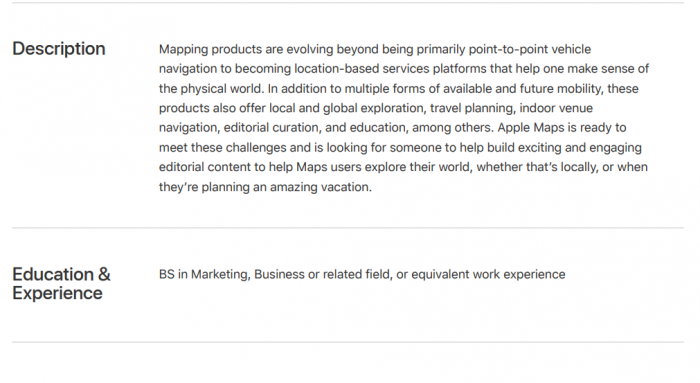 在信息中写道:“[Apple]正在寻找可以帮助构建激动人心且引人入胜社区内容的人才,以帮助Apple Maps用户探索世界。不管是扩展本地生活,或者在计划美好的假期时候。”